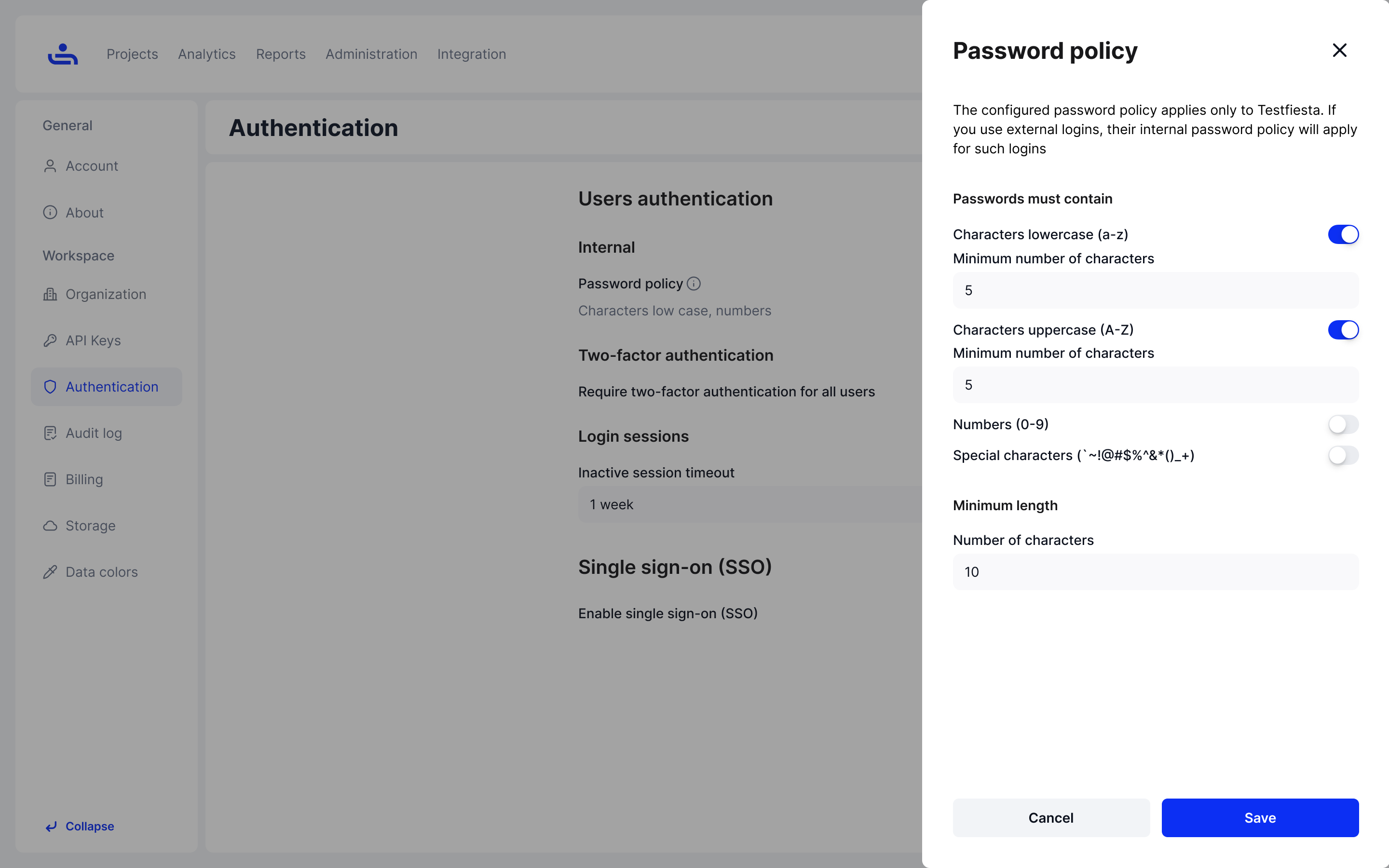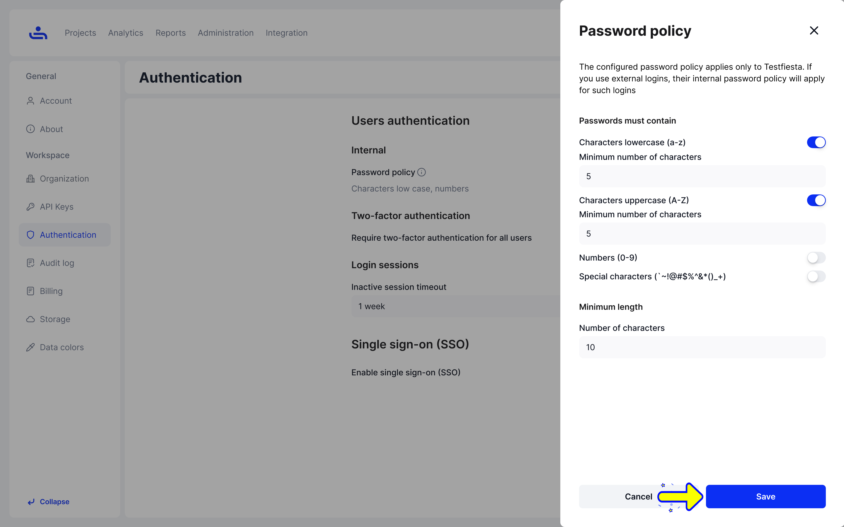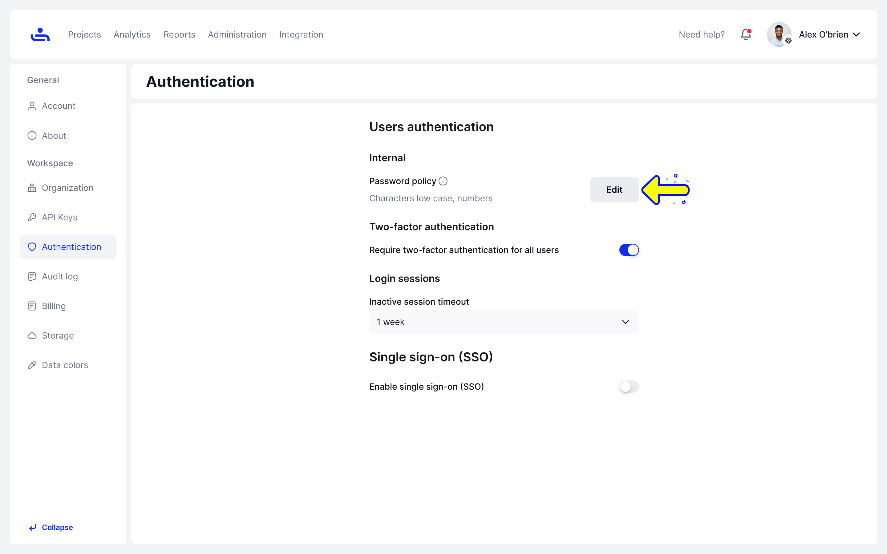On the Authentication tab of your Organization settings, click the "Edit" button to the right of your Password Policy. This will bring out the "Password Policy" sidebar menu