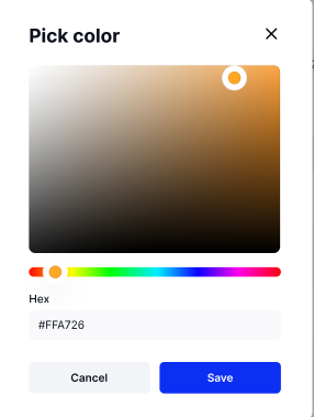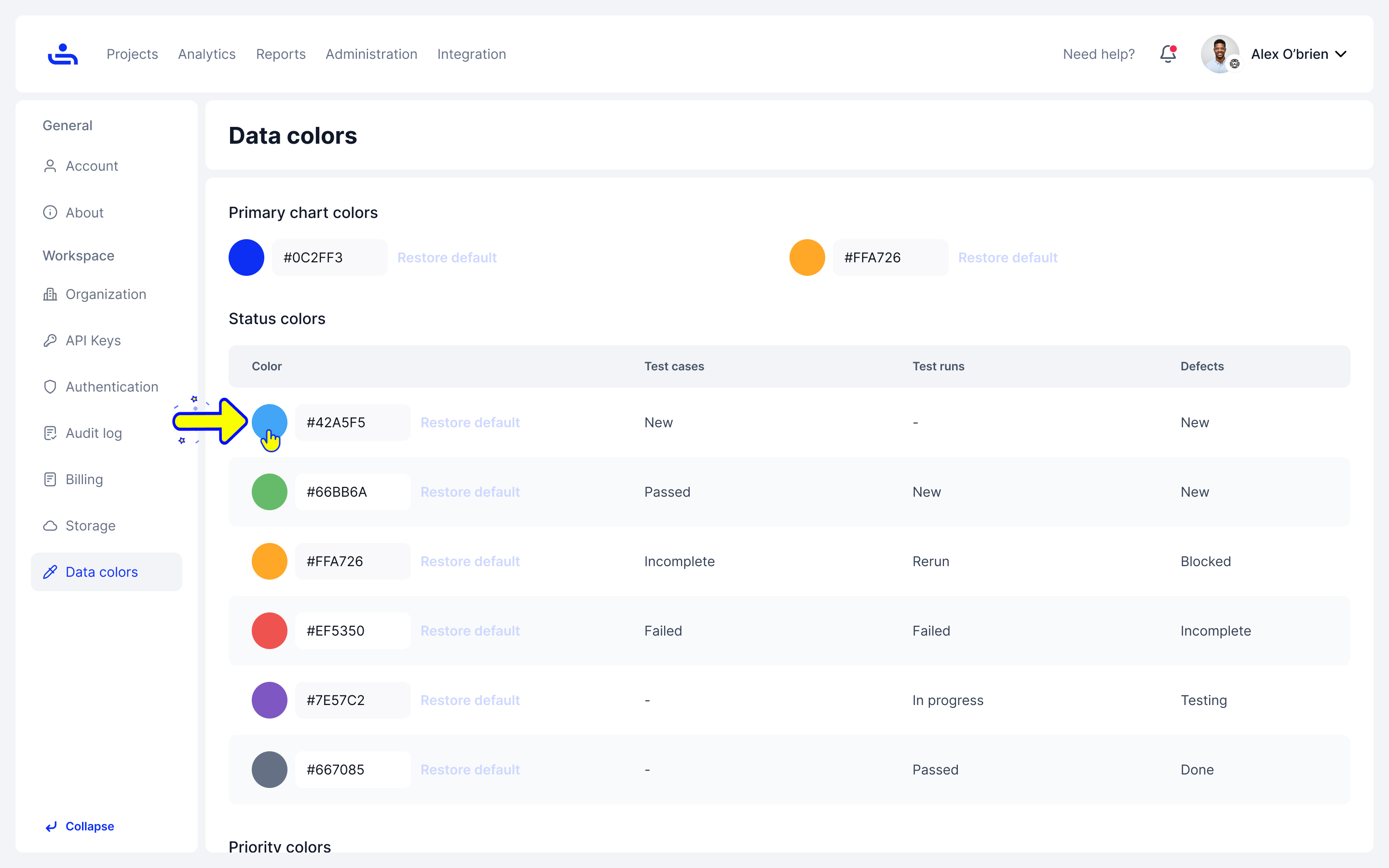 You can change the color for each status by clicking on the current color. A "Pick color" menu will appear and you may pick a new color using the color slider and chart. For this example we will change the Test Case "Active" status color and the Defects "New" status color.