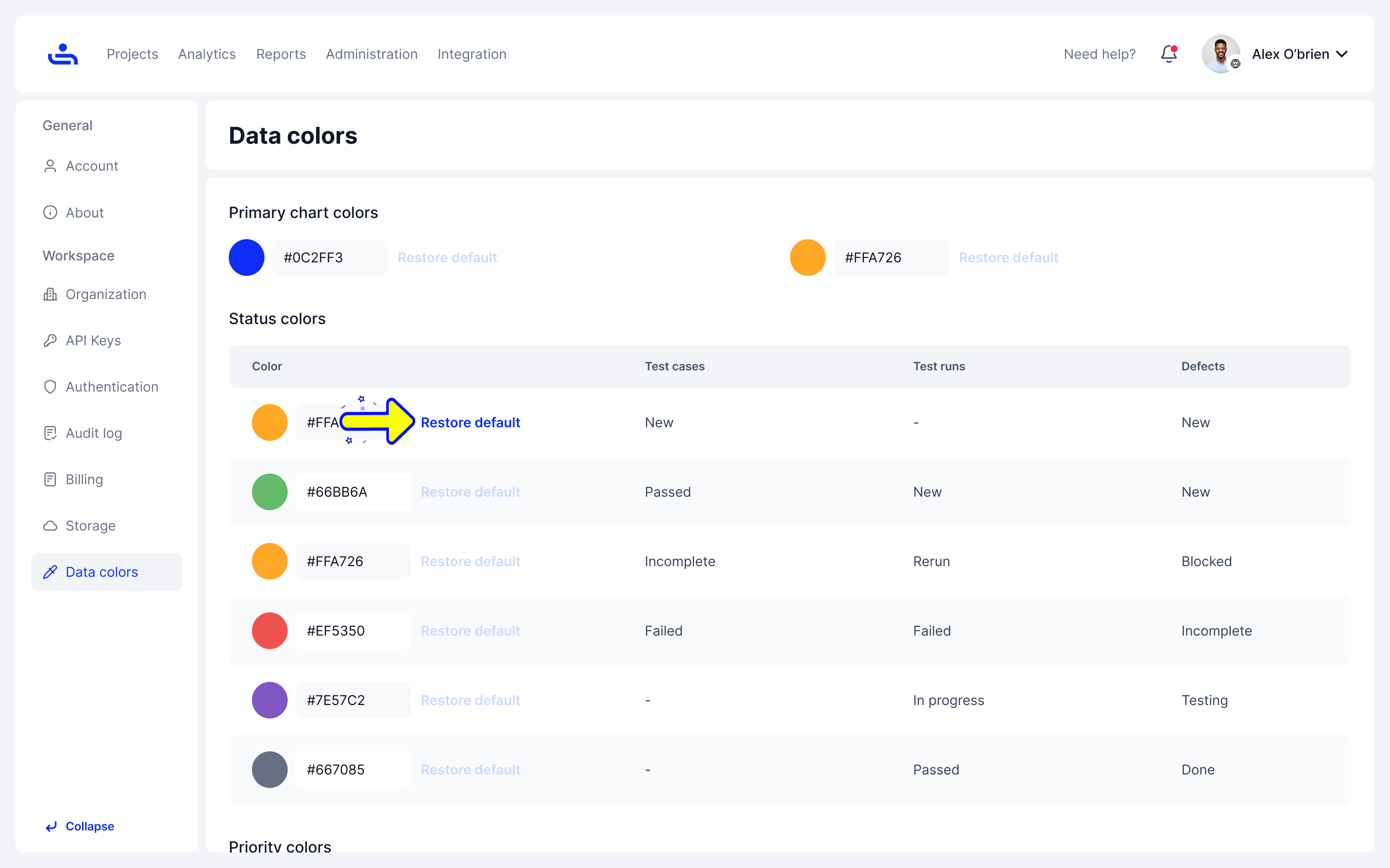 Your Test Case status can be Active, Passed, Incomplete, or Failed and are represented by the colors blue, green, yellow, and red respectively. Charts, Test Runs, Defects, and Priority can also be assigned colors to represent status or type based on the needs of your Organization as shown in the images below.