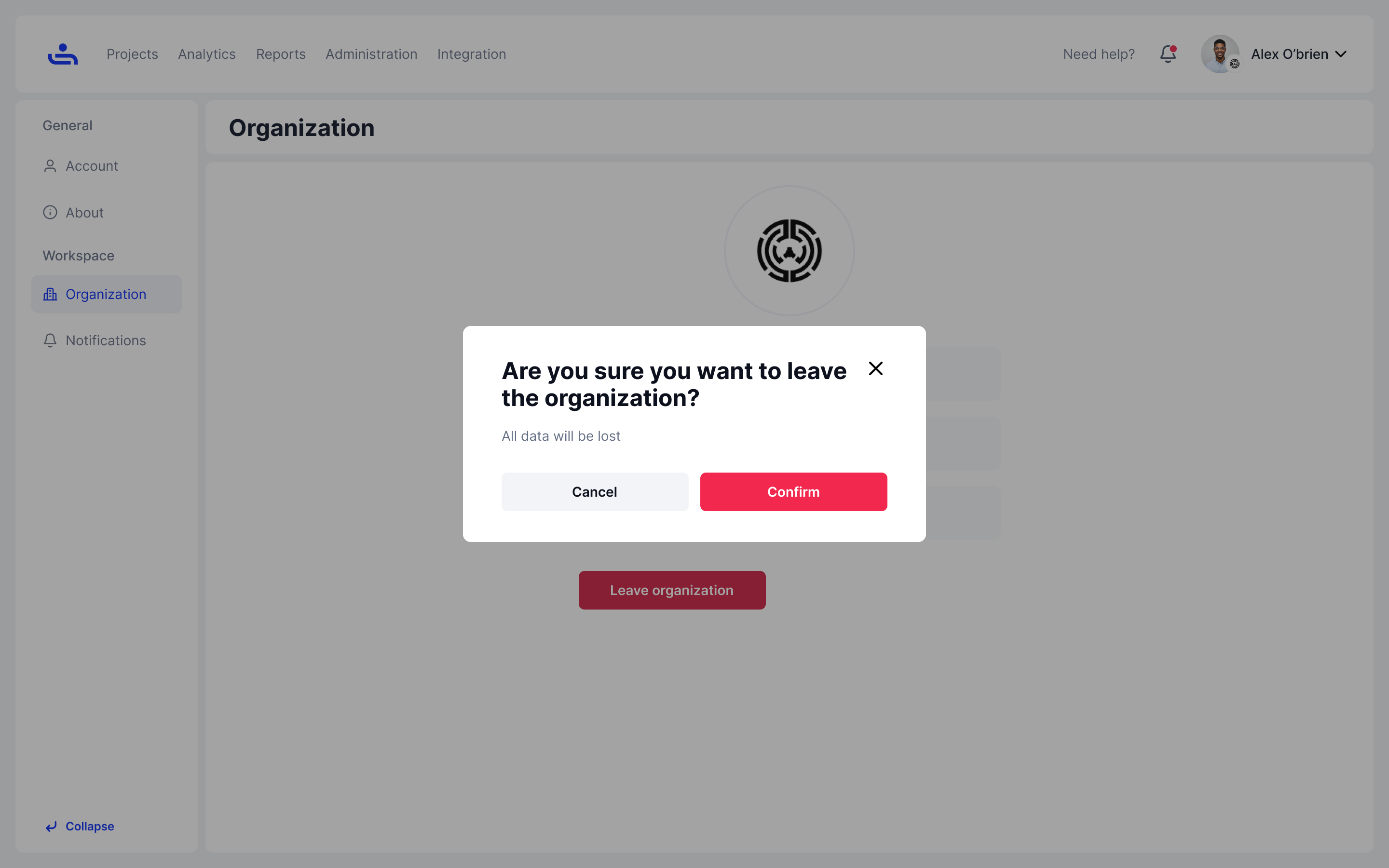 Once you click "Leave Organization" you will be asked to confirm your choice. Click "Confirm" and you will be removed from the Organization