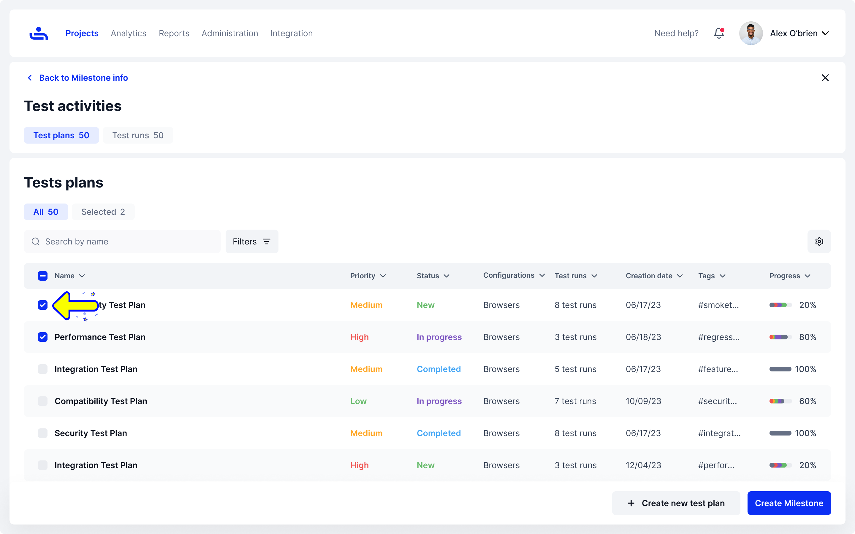 <figure><img src="https://1326643208-files.gitbook.io/~/files/v0/b/gitbook-x-prod.appspot.com/o/spaces%2FnpMhTPhBTwVaw7bZVBjY%2Fuploads%2Fgit-blob-e2061d3b87d2dd0b12e9fe3fca3bae055a06a0d6%2F333_Milestones%2032_Create%20milestone%20-%20Test%20plans.png?alt=media" alt=""><figcaption><p>Select the Test Plans you want to add.</p></figcaption></figure>