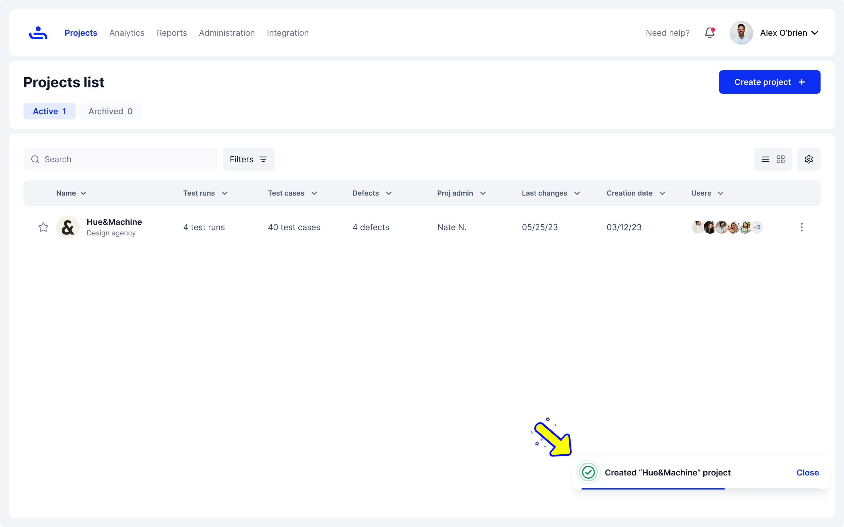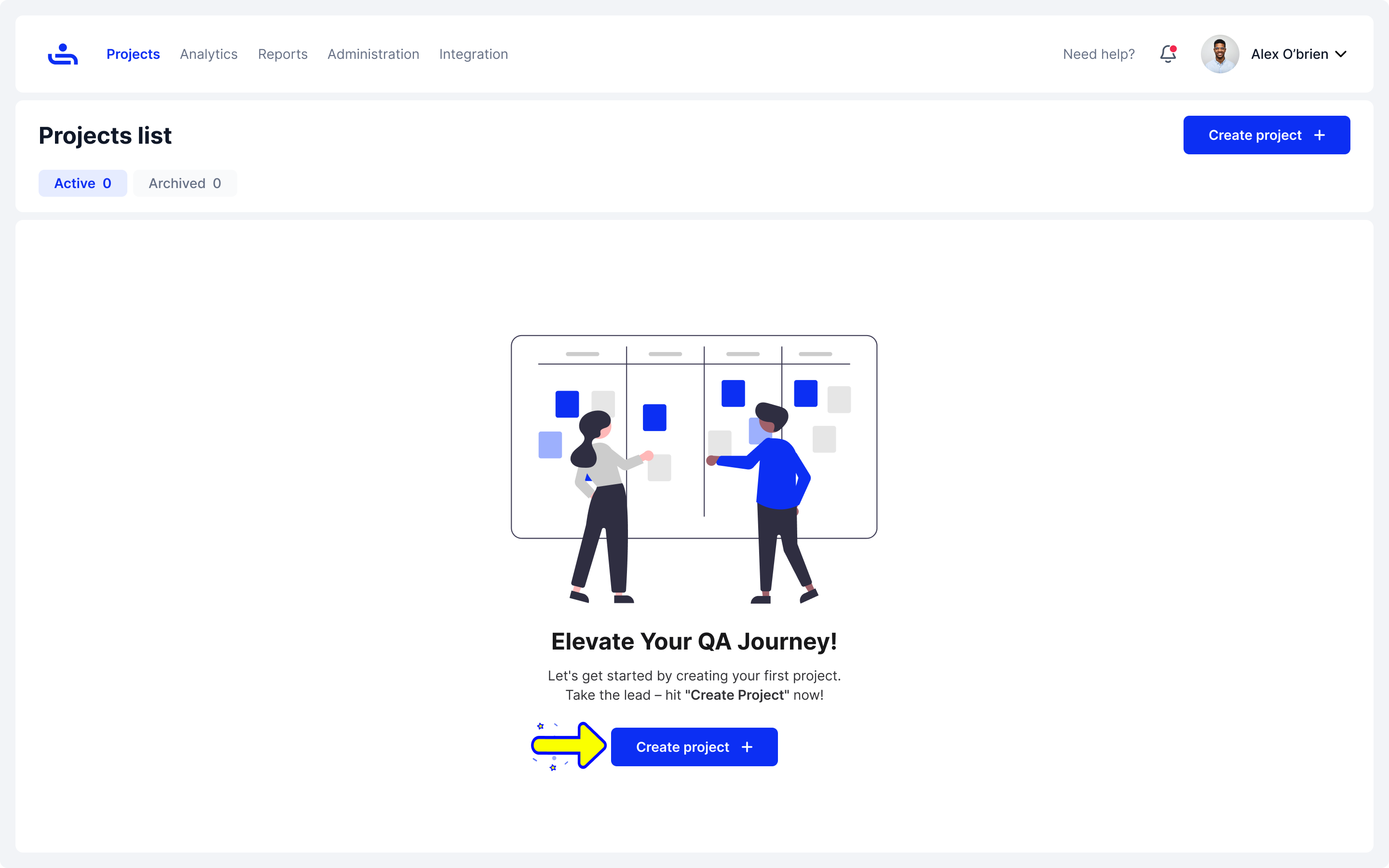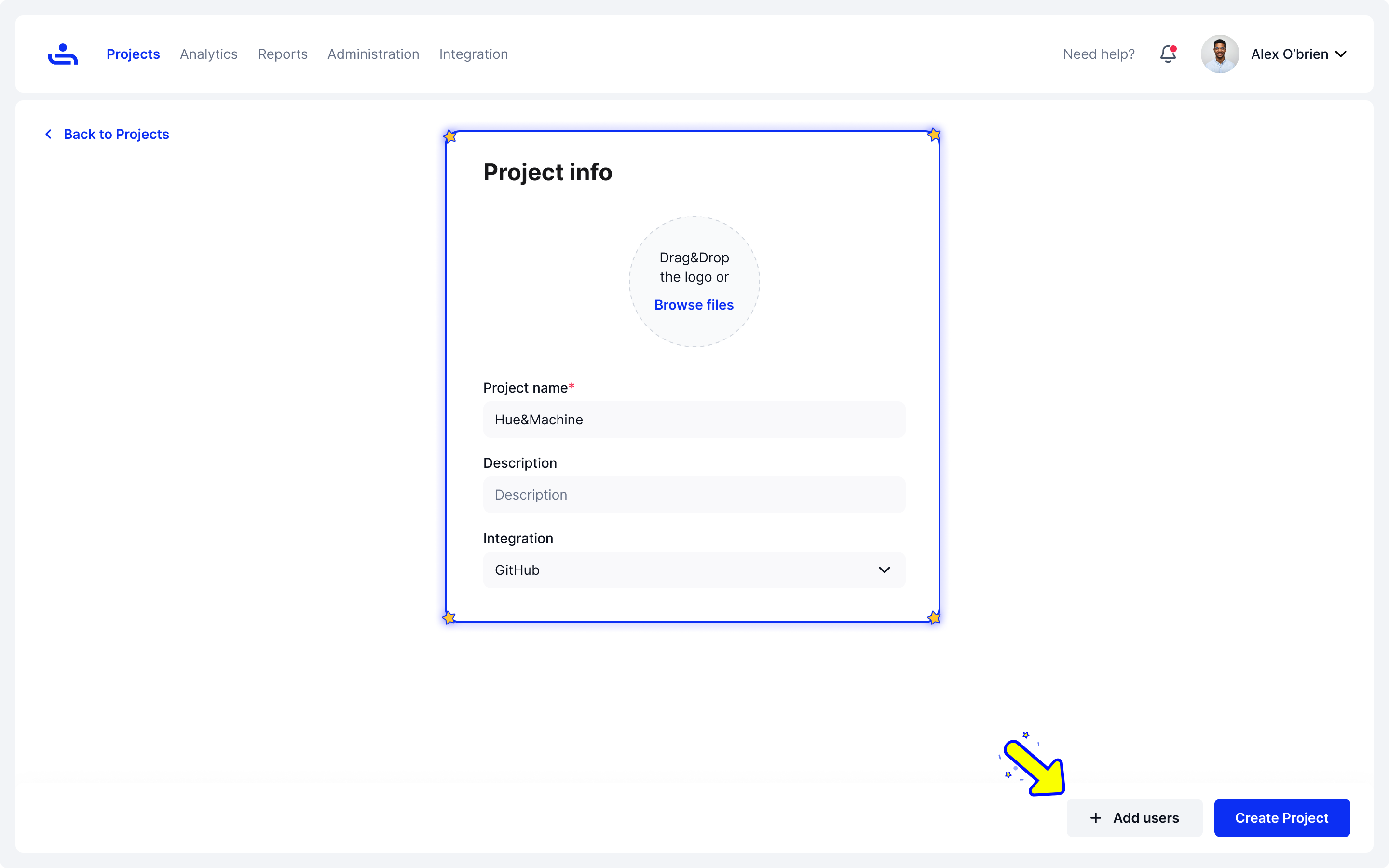 Fill in the Project information in the required fields. You can create a name, add an image, and select an Integration. Click "Create Project" to finish, or "[Add Users](https://docs.testfiesta.com/projects-tab/projects-home-page/creating-new-projects/add-users)" to invite others to your Project.