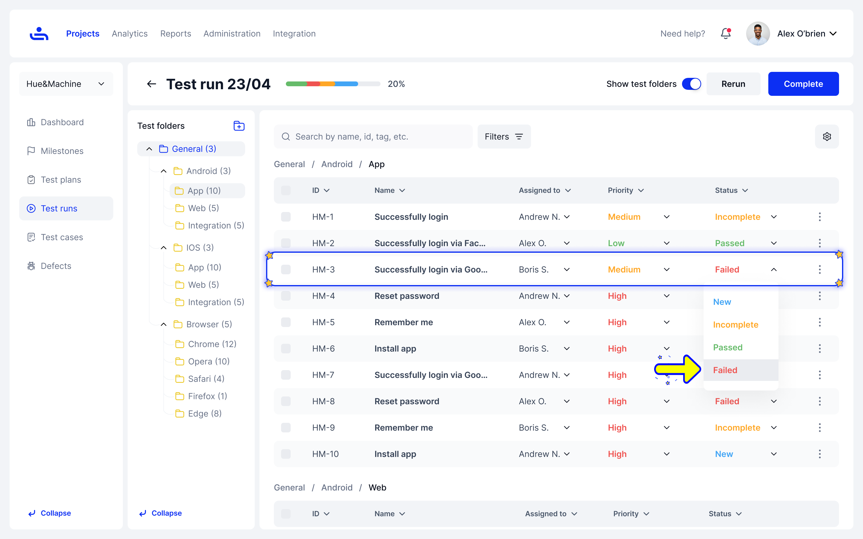 Inside a Test Run, adjust the Test Case status to "Failed"