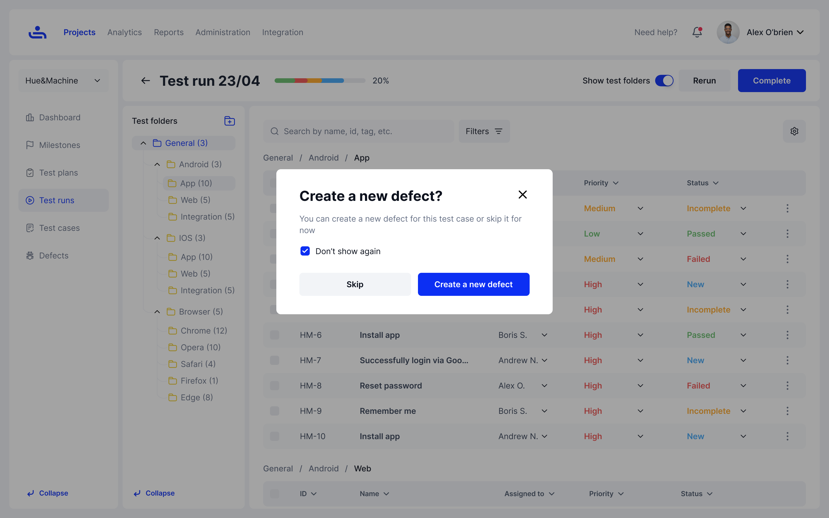 Click "Create new defect" to continue or "Skip" to set the failed status to the Test Case without adding a new Defect.