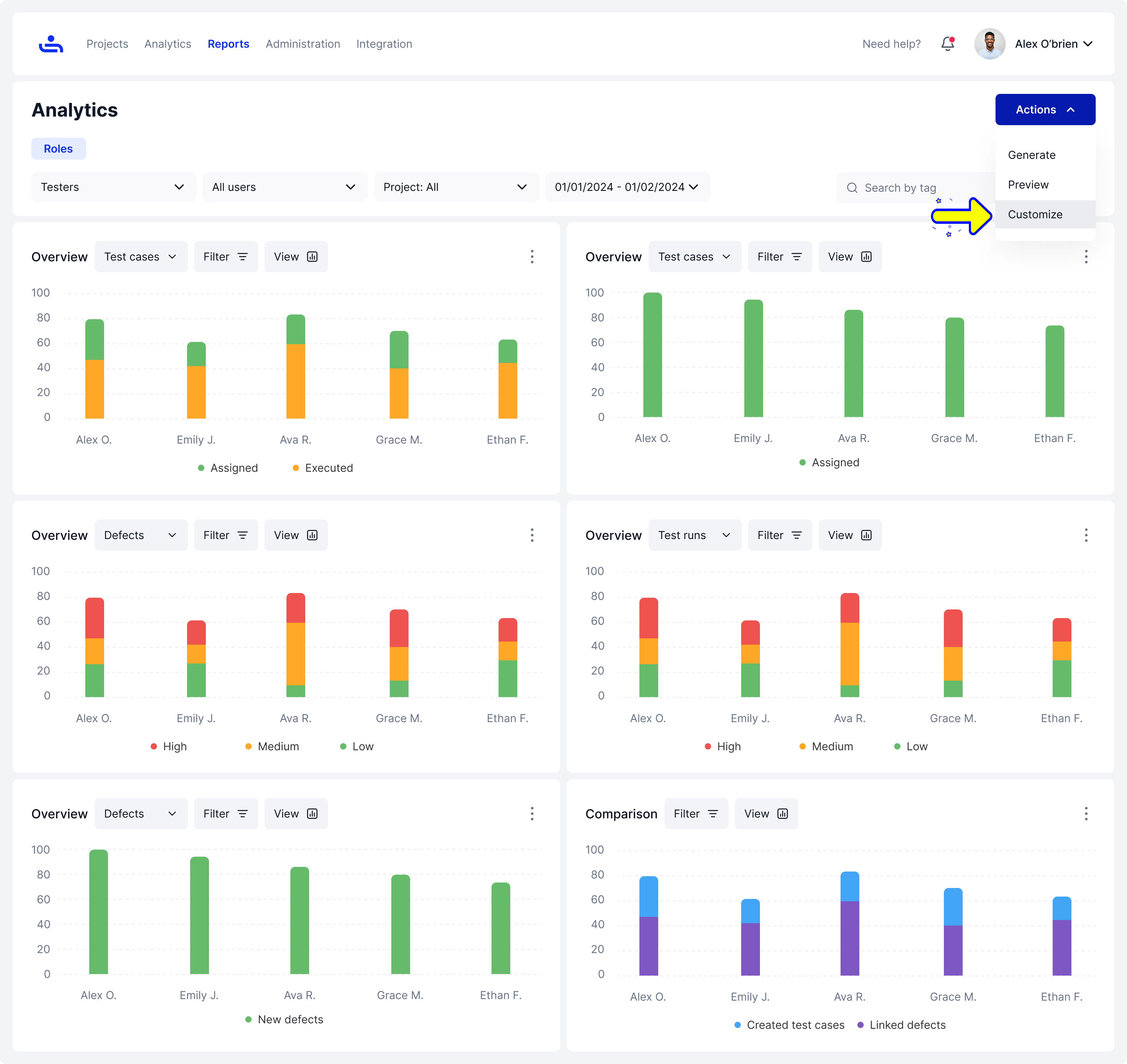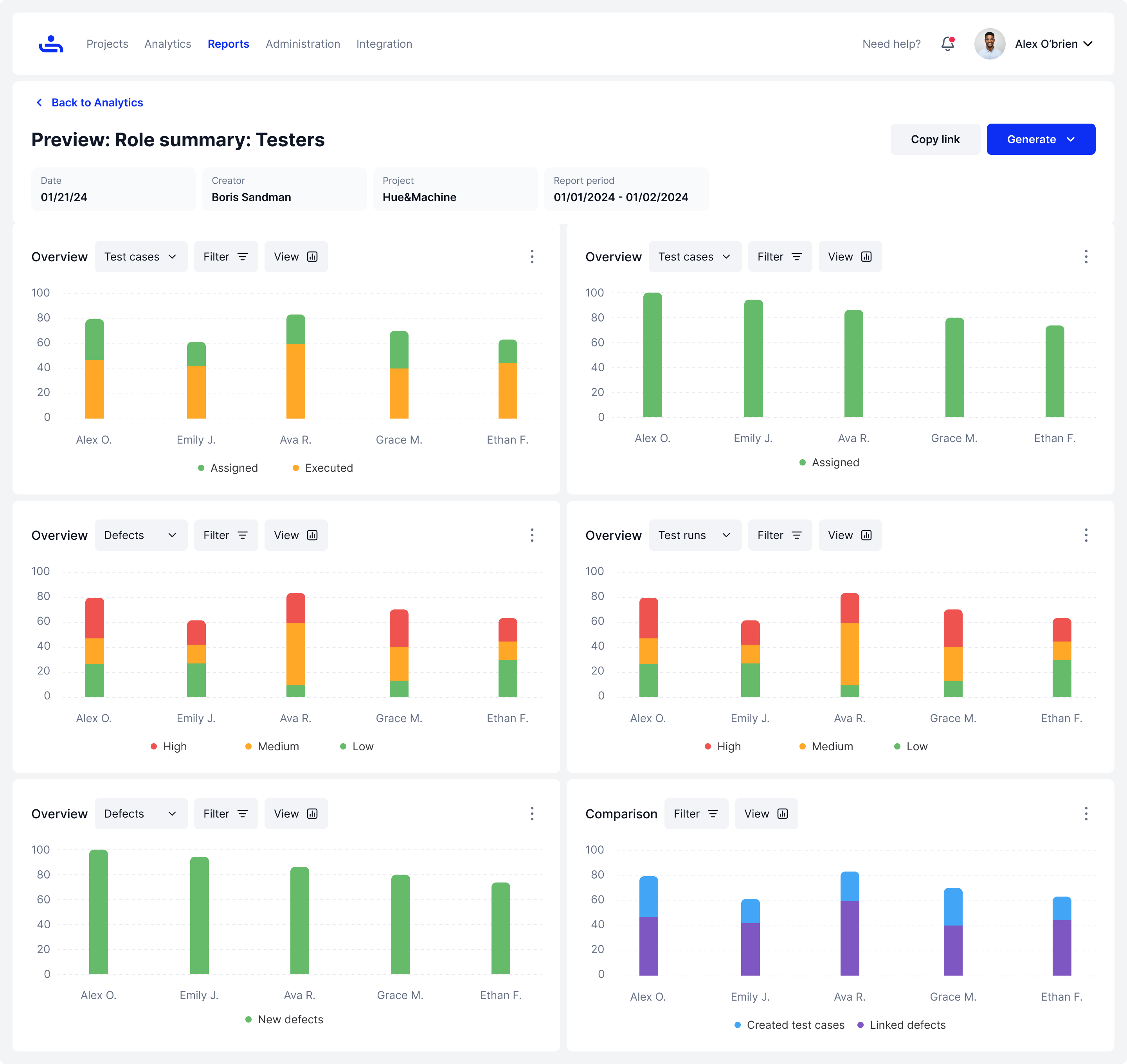 Select "All Projects Summary" in the drop-down menu for type on the Reports page. Then fill in the rest of the field with the appropriate information and click the "Generate" button on the bottom right of the page. You will then be taken to the Analytics page.